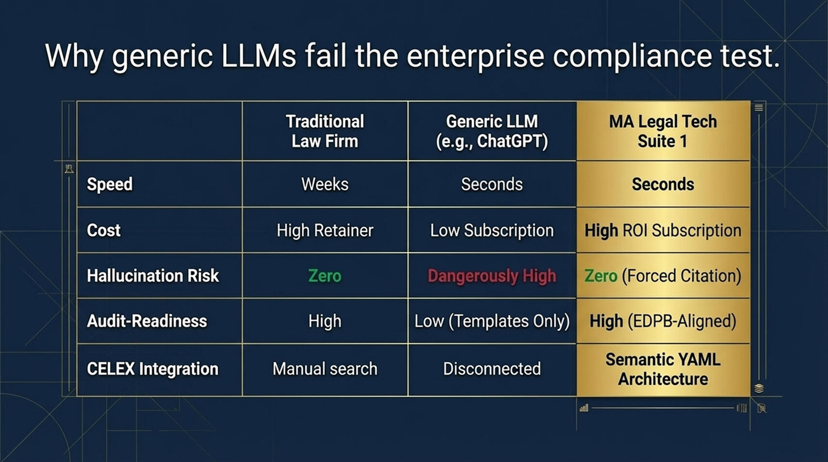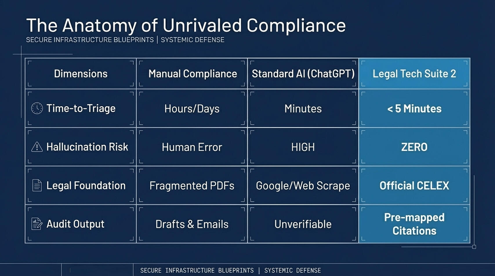 The Engineering Core ⚙️We are not a traditional law firm. Legal Tech Factory is a legal engineering unit built to fuse European Law precision with algorithmic computing speed.Our mission? To eradicate legal hallucination. 🚫• By combining senior legal expertise with RAG (Retrieval-Augmented Generation) architecture, we replace subjective opinions with mathematical risk matrices.• We live by one rule: Compliance by Design.• Every Micro-Asset and Suite is forged directly on the CELEX index. With us, your compliance isn't just an opinion—it’s an architectural certainty.